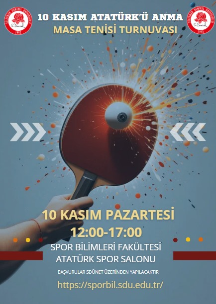 Süleyman Demirel University Faculty of Sport Sciences is organizing the “10 November Atatürk Memorial Table Tennis Tournament.” The tournament will take place on Monday, November 10, 2025, between 12:00 and 17:00 at the Atatürk Sports Hall.