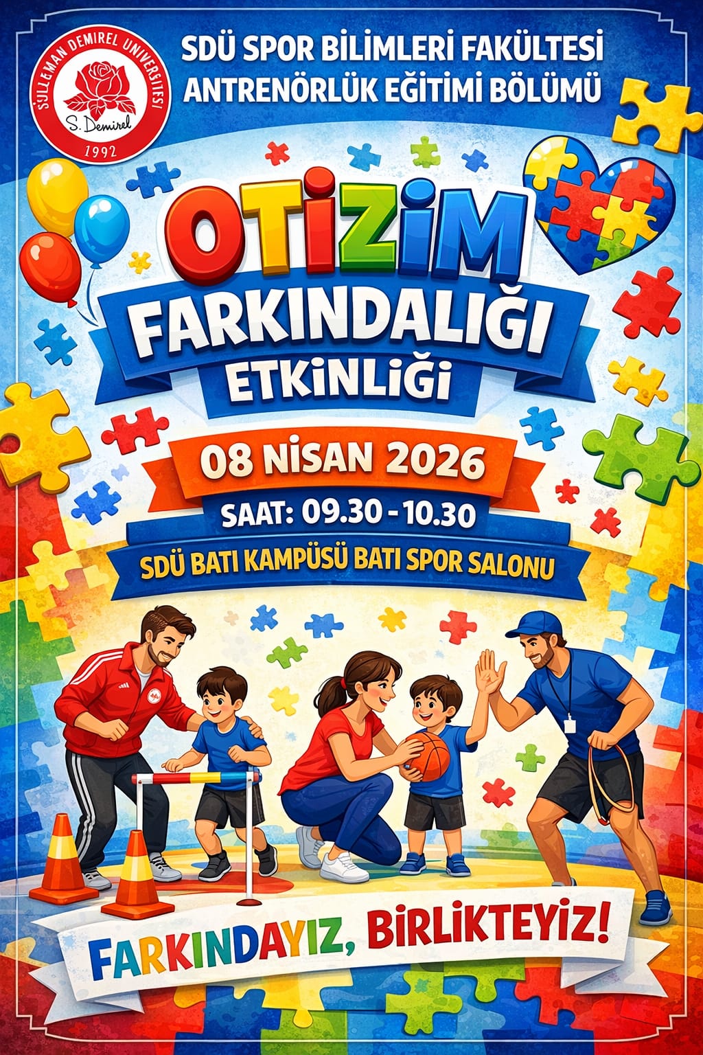 Süleyman Demirel Üniversitesi Spor Bilimleri Fakültesi Antrenörlük Eğitimi Bölümü tarafından Otizm Farkındalığı Günü kapsamında bir etkinlik düzenlenecektir. 08 Nisan 2026 tarihinde Batı Kampüsü Batı Spor Salonu’nda gerçekleştirilecek etkinlik, 09.30 – 10.00 saatleri arasında yapılacaktır. Otizme yönelik farkındalık oluşturmayı amaçlayan etkinliğe tüm öğrencilerimiz davetlidir.
