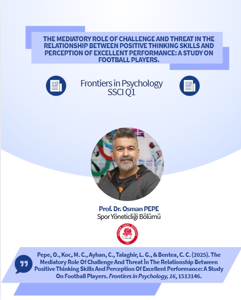 Spor Yöneticiliği Bölümü öğretim üyesi Prof. Dr. Osman Pepe, uluslararası alanda saygınlığı yüksek olan Frontiers in Psychology (Q1) dergisinde 2025 yılında yayımlanan “The Mediatory Role of Challenge and Threat in the Relationship Between Positive Thinking Skills and Perception of Excellent Performance: A Study on Football Players” adlı makalesiyle önemli bir akademik başarıya imza attı.
