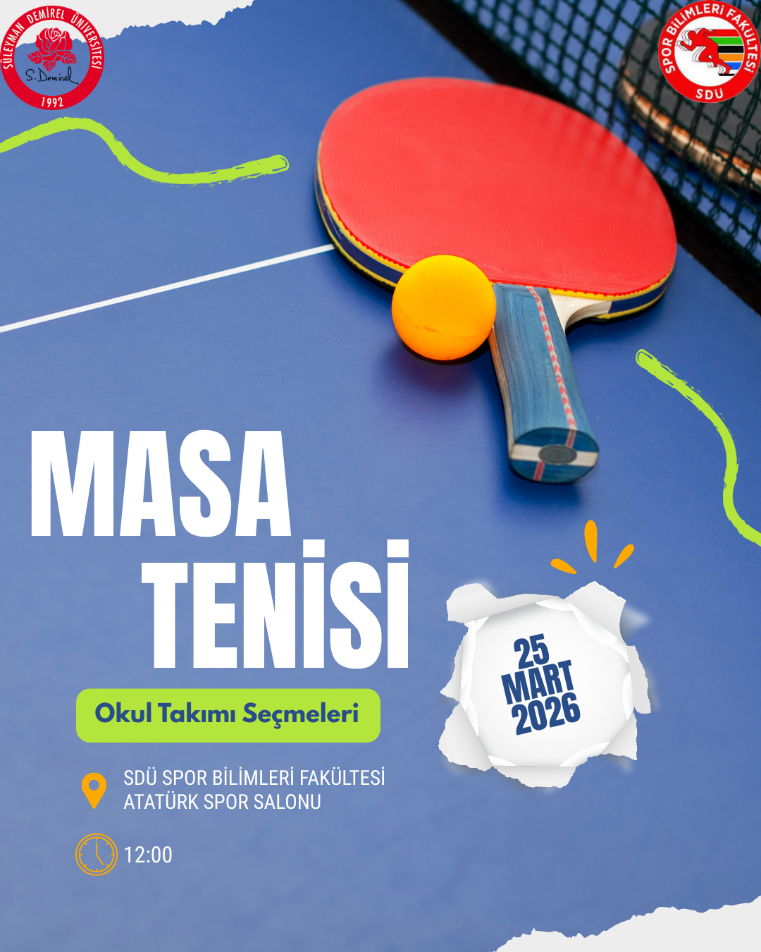 Süleyman Demirel Üniversitesi Masa Tenisi Okul Takımı seçmeleri 25 Mart 2026 tarihinde gerçekleştirilecektir. Seçmeler, Süleyman Demirel Üniversitesi Spor Bilimleri Fakültesi Atatürk Spor Salonu Step-Aerobik Salonu’nda saat 12.00’de yapılacaktır. Seçmelere katılacak sporcuların kendi raketleri ve sportif kıyafetleri ile hazır bulunmaları gerekmektedir. Ayrıca seçmelere katılacak öğrencilerin aşağıda yer alan başvuru formunu doldurmaları gerekmektedir. Tüm öğrencilerimize duyurulur.