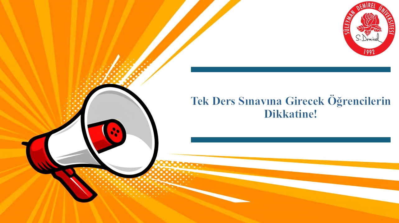 Süleyman Demirel Üniversitesi Önlisans ve Lisans Eğitim Öğretim ve Sınav Yönetmeliğinin Sınavlar Başlıklı 20’nci maddesinin 5’inci bendinde ‘‘Bahar Yarıyılı, güz yarıyılı veya varsa yaz okulu sonunda en az 2.00 GNO ile mezuniyet durumunda olup, staj dersi hariç sadece bir dersten FF veya FD ile başarısız olan o derse devam etmiş öğrenciler için, dönemine bakılmadan tek ders sınavı adıyla bir defaya mahsus olmak üzere sınav hakkı verilir’’ hükmü uyarınca fakültemize müracaat eden öğrencilerin dilekçelerine belirtilen derslerden tek ders sınavına girmeleri uygun görülmüş olup, fakültemize ait derslerden tek ders sınavına girecek öğrencilerin tek ders sınavı 04.02.2026 Çarşamba günü saat 11.00 de Doğu fakültemizde yapılacaktır.
